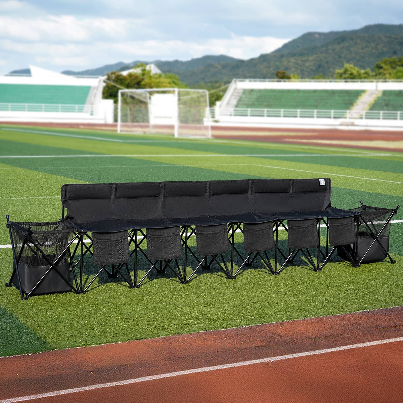 The fully expanded team bench measures approximately 132" L x 16" W x 30" H, providing six connected seats with 16" of width per person. The supportive backrest stands at 11" high, offering added comfort during games and events.When folded, the bench fits neatly into the included carry bag, measuring just 31" x 27" x 8" for convenient transport and storage.