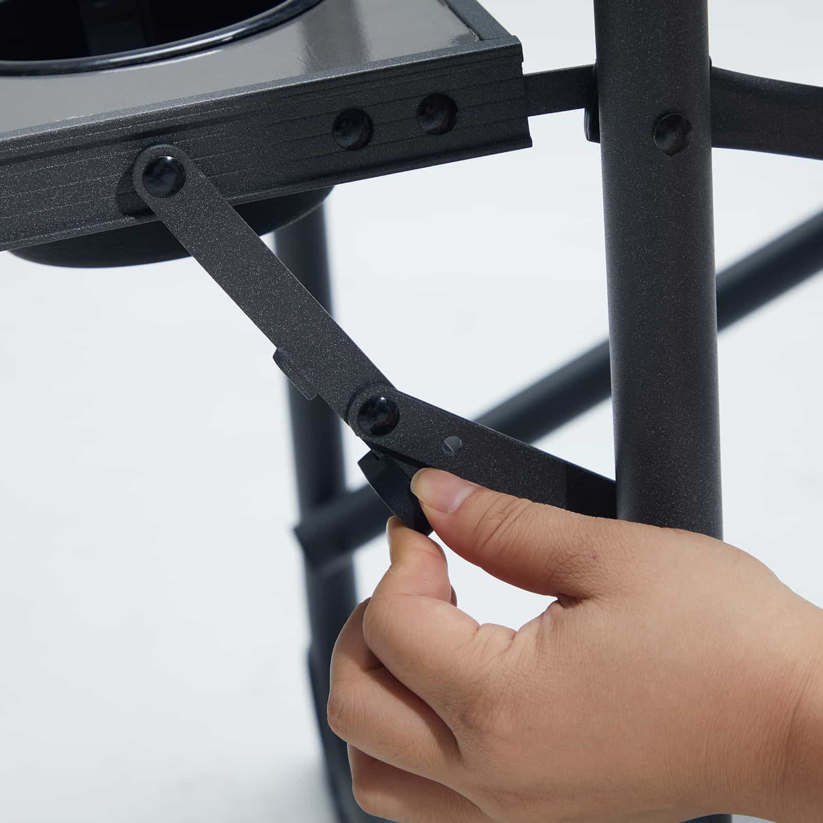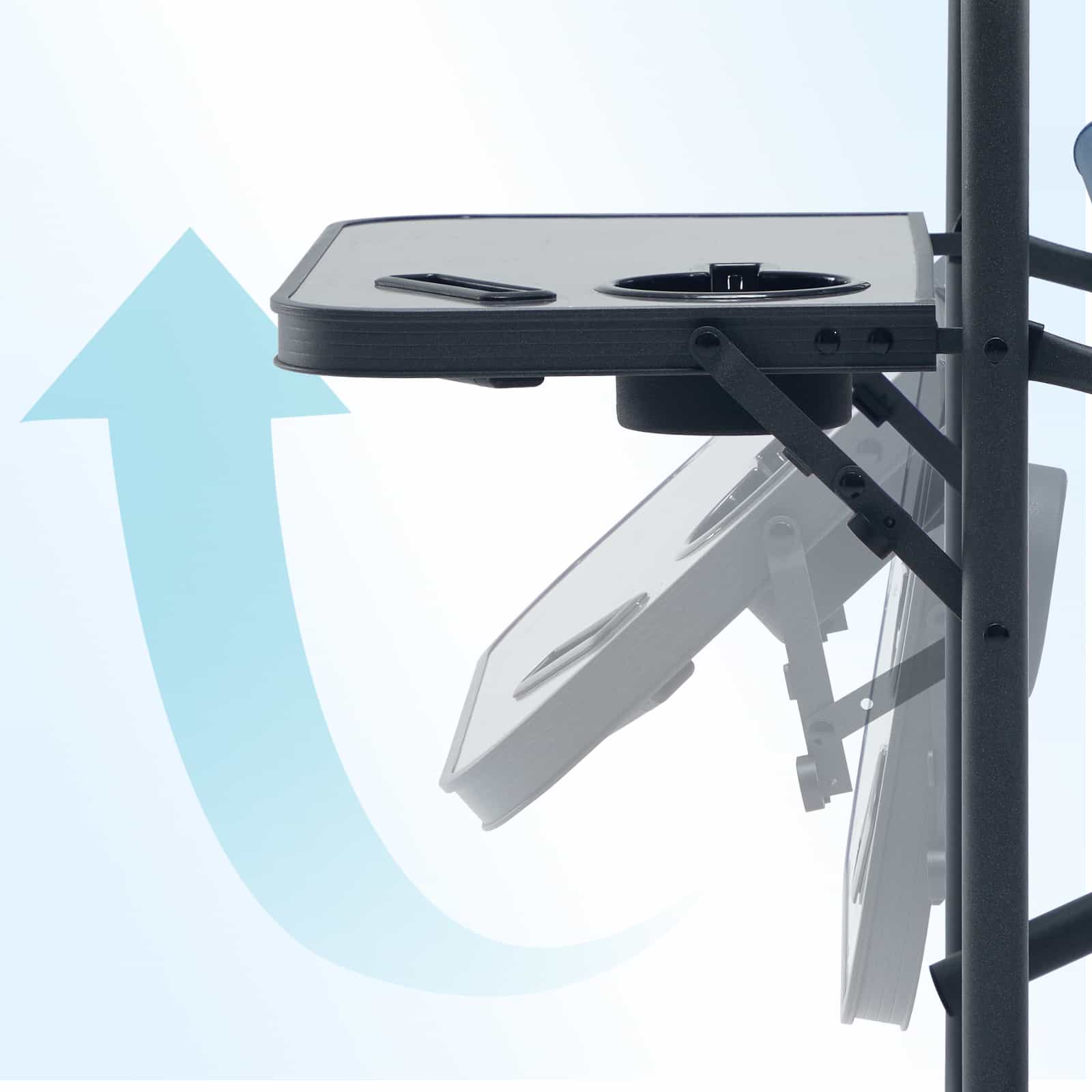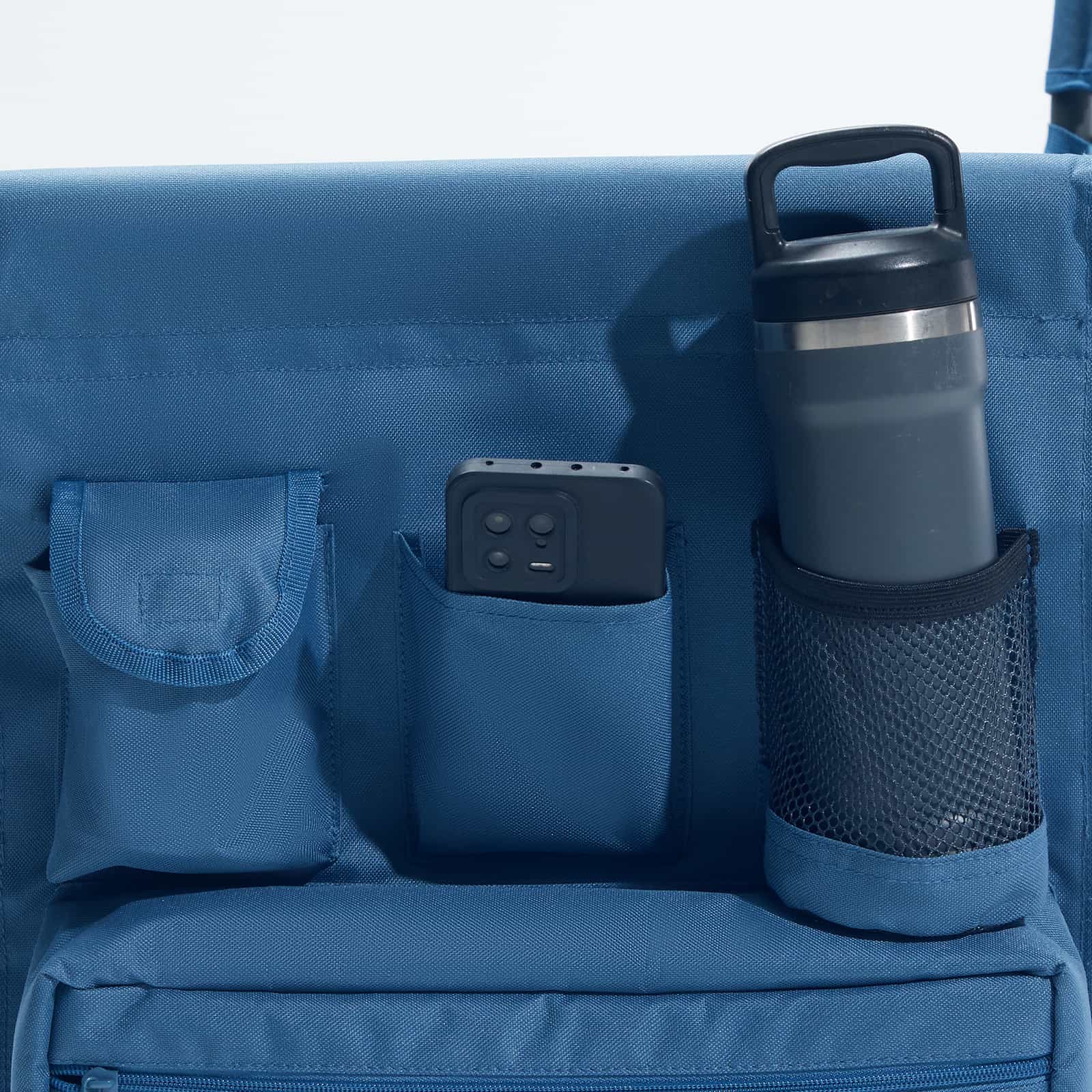 Built-in folding side table with cup holder, plus a cooler bag and side pocket to keep drinks, snacks, and personal items close at hand.