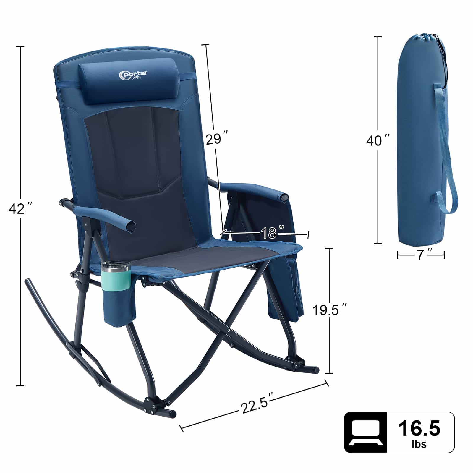 This camping rocking chair has a 29" high padded backrest fully supports shoulders & head for relaxing comfort. It also comes with side pockets and a cup holder for added convenience outdoors.