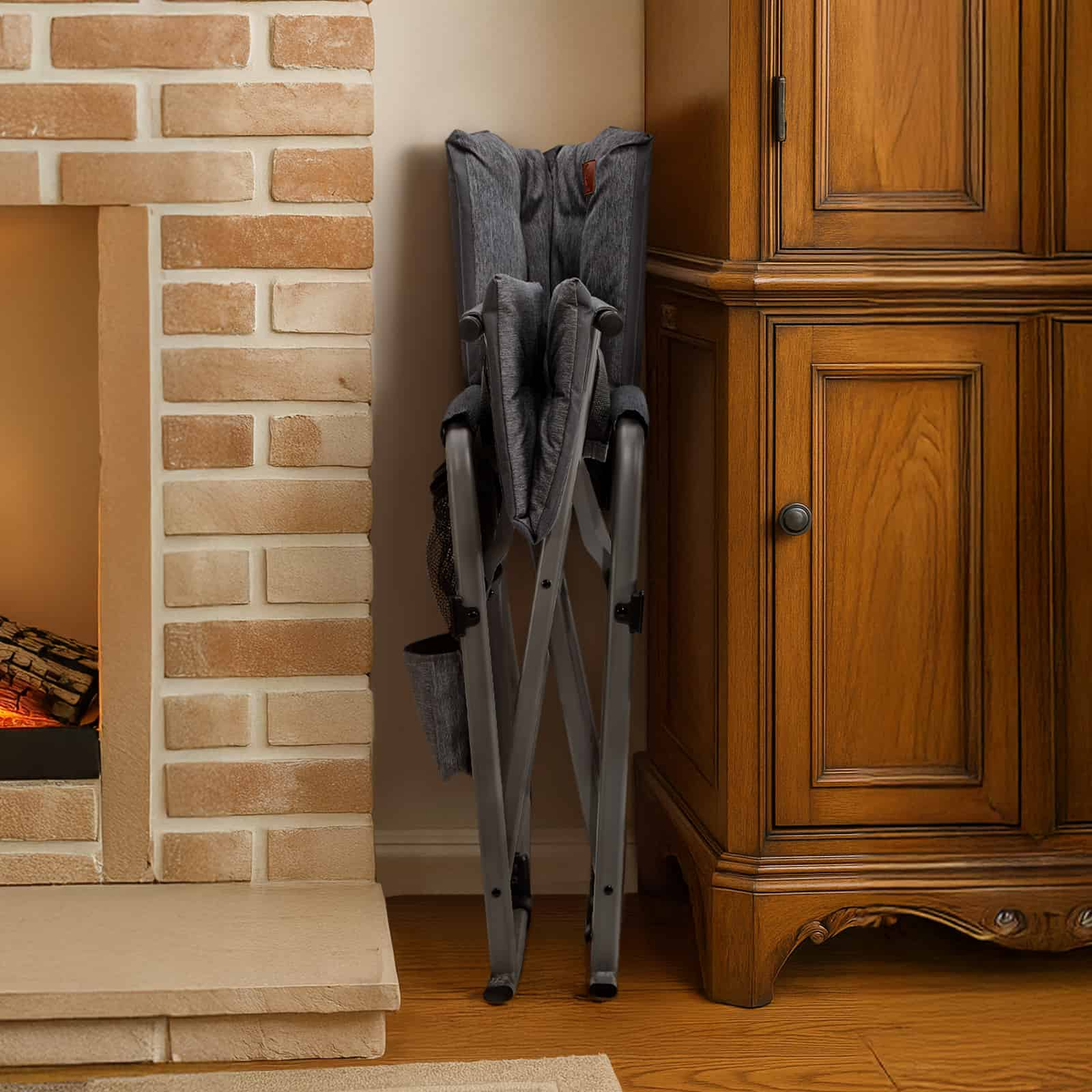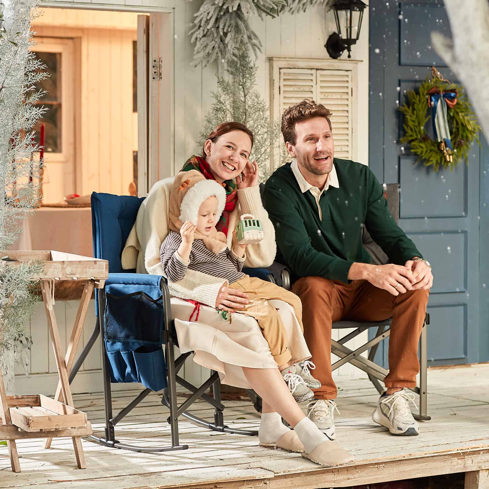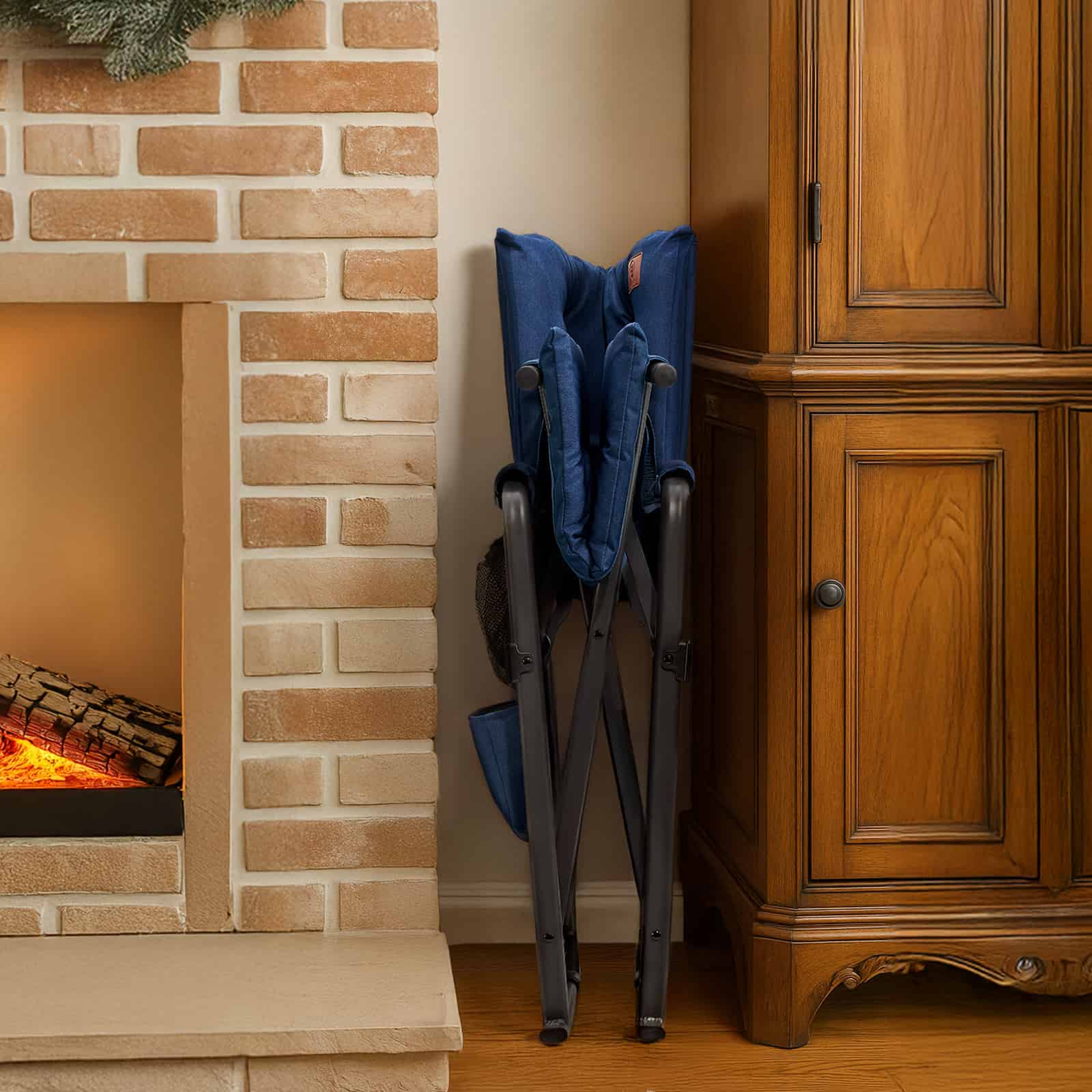 This lightweight rocking chair folds flat for easy transport and storage. It features a padded seat, a sturdy powder‑coated steel frame rated to 300 lb, and hard armrests for comfort and support at home or on any outdoor adventure.