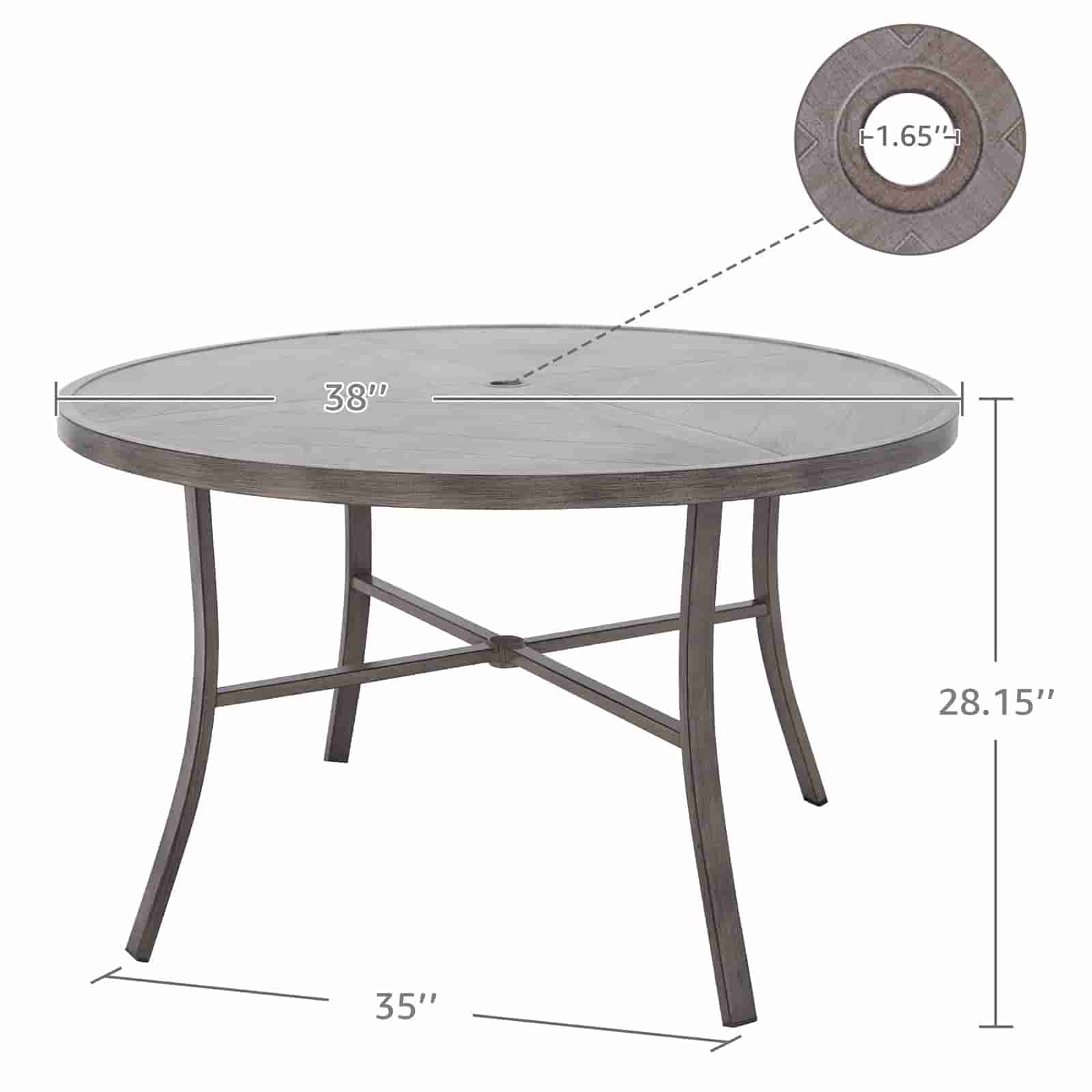 This patio dining set features a 360° swivel & rocker chair with a wide, comfortable 4" Olefin cushion. Crafted with a rust-resistant powder-coated steel frame, it also showcases an imitation wood finish. The set includes a 38" round table and an optional umbrella hole with cover.