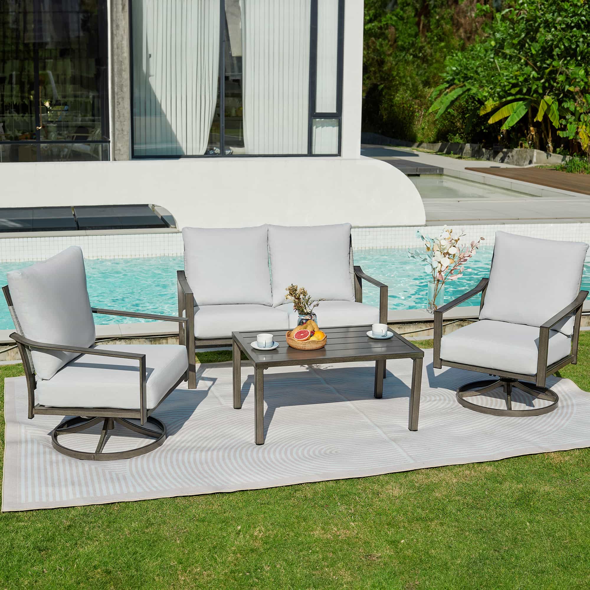 The 4-piece patio furniture set comes with 5.5" thick cushions, filled with a high-resiliency sponge core and covered with premium olefin fabric. The cushion’s plush softness makes you feel like you’re sitting on a cloud. With this comfortable seating, your outdoor moments become more enjoyable and memorable. The cushion cover is water-resistant and removable (easy to clean), keeping it looking like new even after years of use.