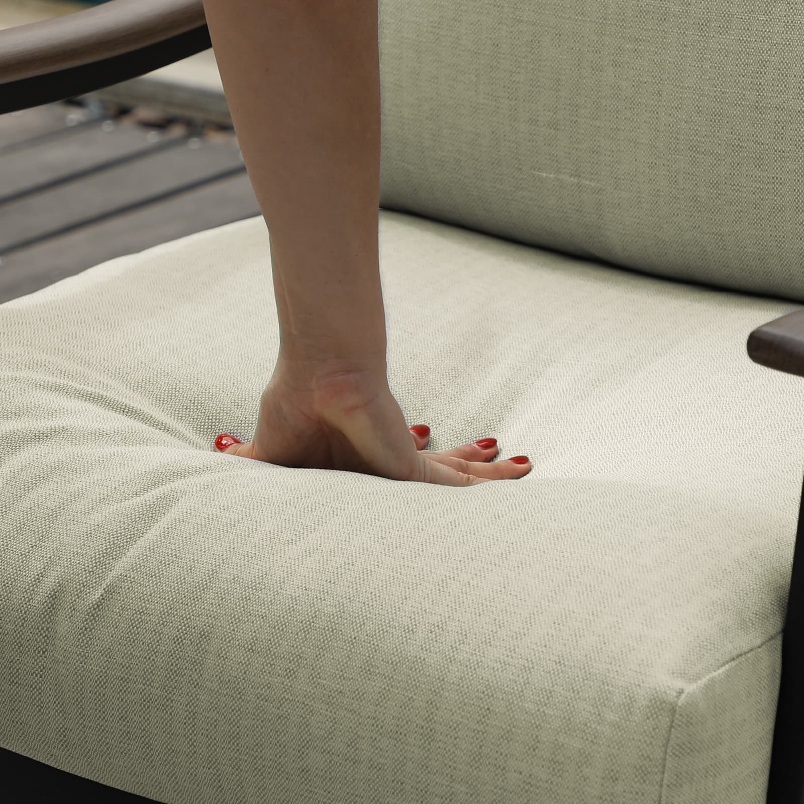 This outdoor sofa set features a distinctive high-back rattan woven design that adds elegance and charm to your balcony, terrace, or porch. The hand-brushed wood grain aluminum armrests are ergonomically curved to provide superior comfort and relaxation, blending style and function for an elevated outdoor experience.