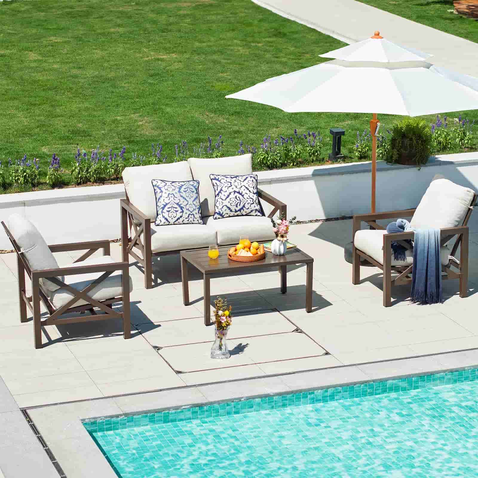This 4-piece metal patio conversation set features a durable, powder-coated iron frame for long-lasting weather resistance. The high-quality Olefin fabric provides superior sun protection and aging resistance, while the included toolkit ensures quick and easy assembly, making setup and maintenance a breeze.