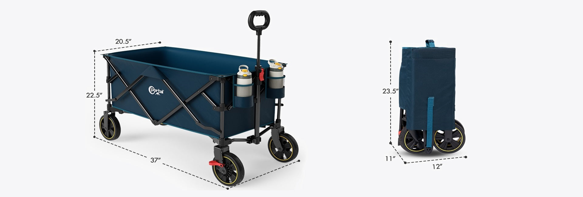 The folding wagon cart has 360° rotating anti-skid front wheels with brakes, they are designed for smooth roll, easy turn and stop. The adjustable telescoping handle provides comfortable and effortless pulling.